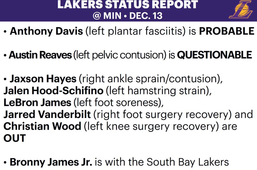 12月13日讯 湖人官方刚刚更新了明日9点客战森林狼的伤病报告,詹姆斯因为左脚酸痛确定缺席。