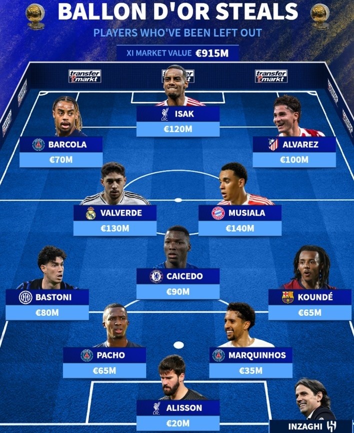 德转列落选金球提名阵容:伊萨克、巴尔韦德、穆西亚拉领衔