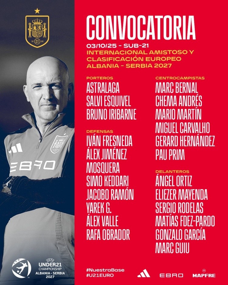 西班牙U21名单:伯纳尔、贡萨洛-加西亚、莫斯克拉、吉乌在列
